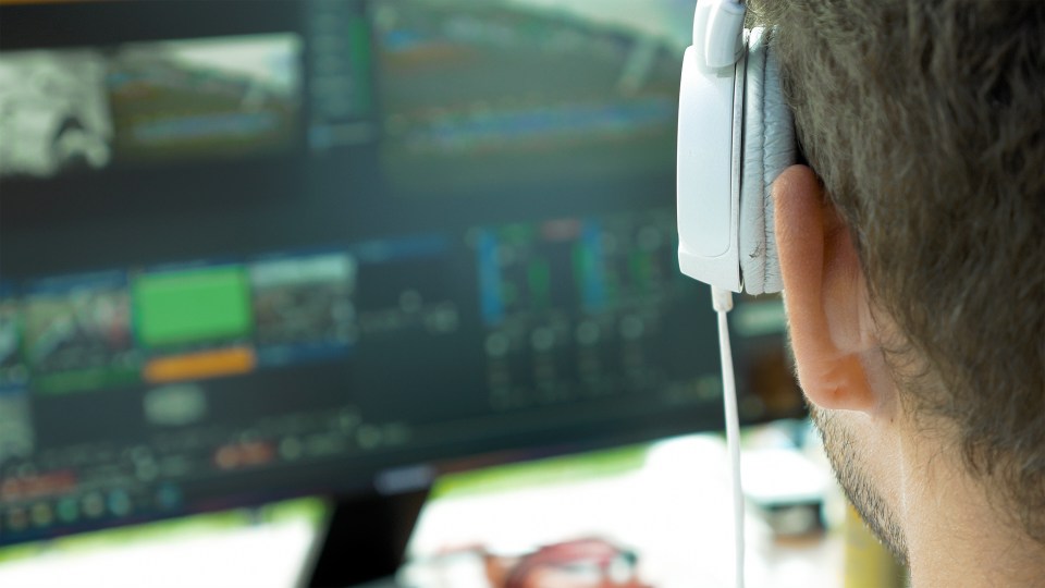 Video broadcast editor with headphones at screen ← Previous Next → Video broadcast editor with headphones watching an action on the monitor. Live TV broadcasting process.